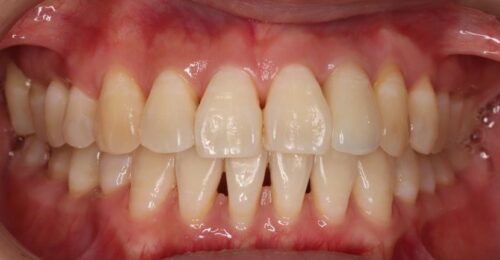 患者様は前歯の歯並びも気になるとお話しされており、まずは術前矯正としてマウスピース矯正・インビザライン(*1)を開始し、6か月で前歯のガタガタを整えました。