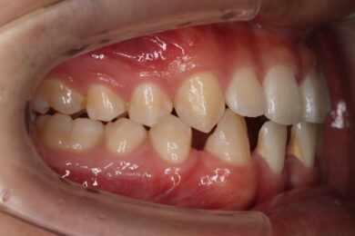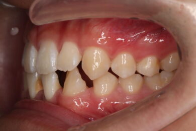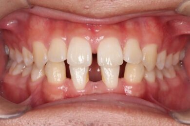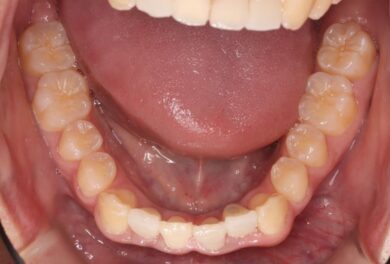 下顎の前歯は通常6本ですが、中央から2番目の歯(側切歯)が左右2本とも欠損している先天性欠如の患者様です。