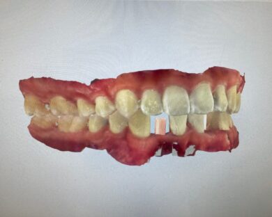 インビザラインの治療計画では、下顎前歯がより美しく審美的に並ぶよう、ご自身の歯とインプラントの歯がほぼ同じ幅径になるよう計算し配列を行いました。