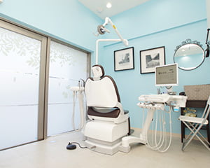 ティファニーブルーの壁紙に診療台が並ぶ診療室です。目に見える範囲に極力物を置かない、シンプルな内装となっています。