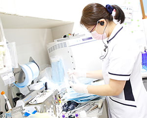 スタッフが作業をするバックヤードのうち、洗浄・消毒・滅菌のために設けられたコーナーです。ここで器具の種類に応じて必要な処理を行います。専用のスペースを設けることで、取り違えのミスを防ぐほか、作業効率アップに繋がっています。
