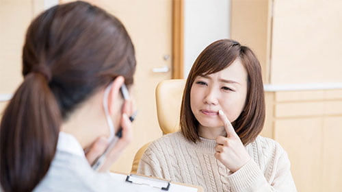 大きく口があけられない、痛みがある、顎がカクカク鳴るといった症状をともなう顎関節症も当院で治療を受けられます。こめかみの下にある顎の関節を顎関節といい、ここに異常が生じると口が開きにくくなったり、開いた時に痛みや音が生じたりします。